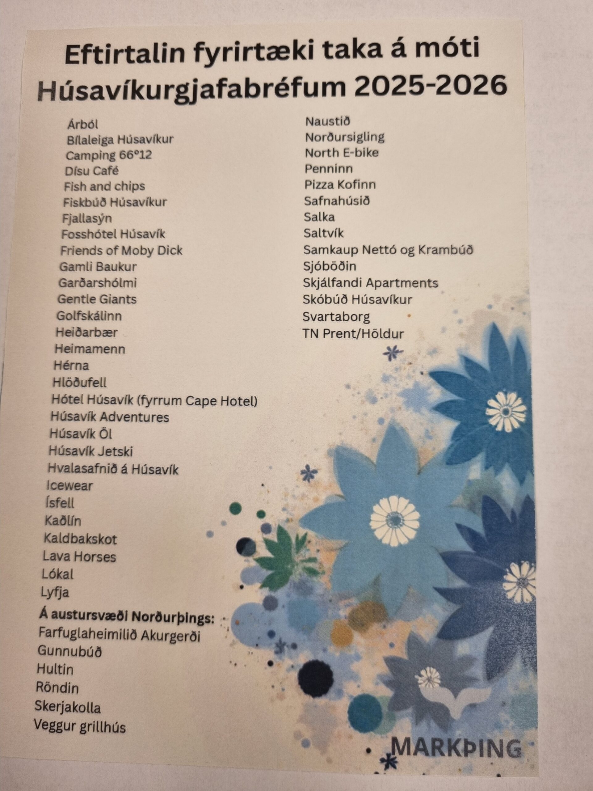 Eins og áður er afar mikilvægt að Þingeyingar versli í heimabyggð, ekki síst fyrir jólin, þegar jólaverslunin fer fram. Góð leið til að gleðja sína nánustu sem og aðra er að kaupa Húsavíkurgjafabréf í Sparisjóðnum sem er með bréfin til sölu. Um 50 verslunar- og þjónustuaðilar taka við bréfunum. Koma svo og verslum í heimabyggð, þannig styðjum við sterkara samfélag í Þingeyjarsýslum.