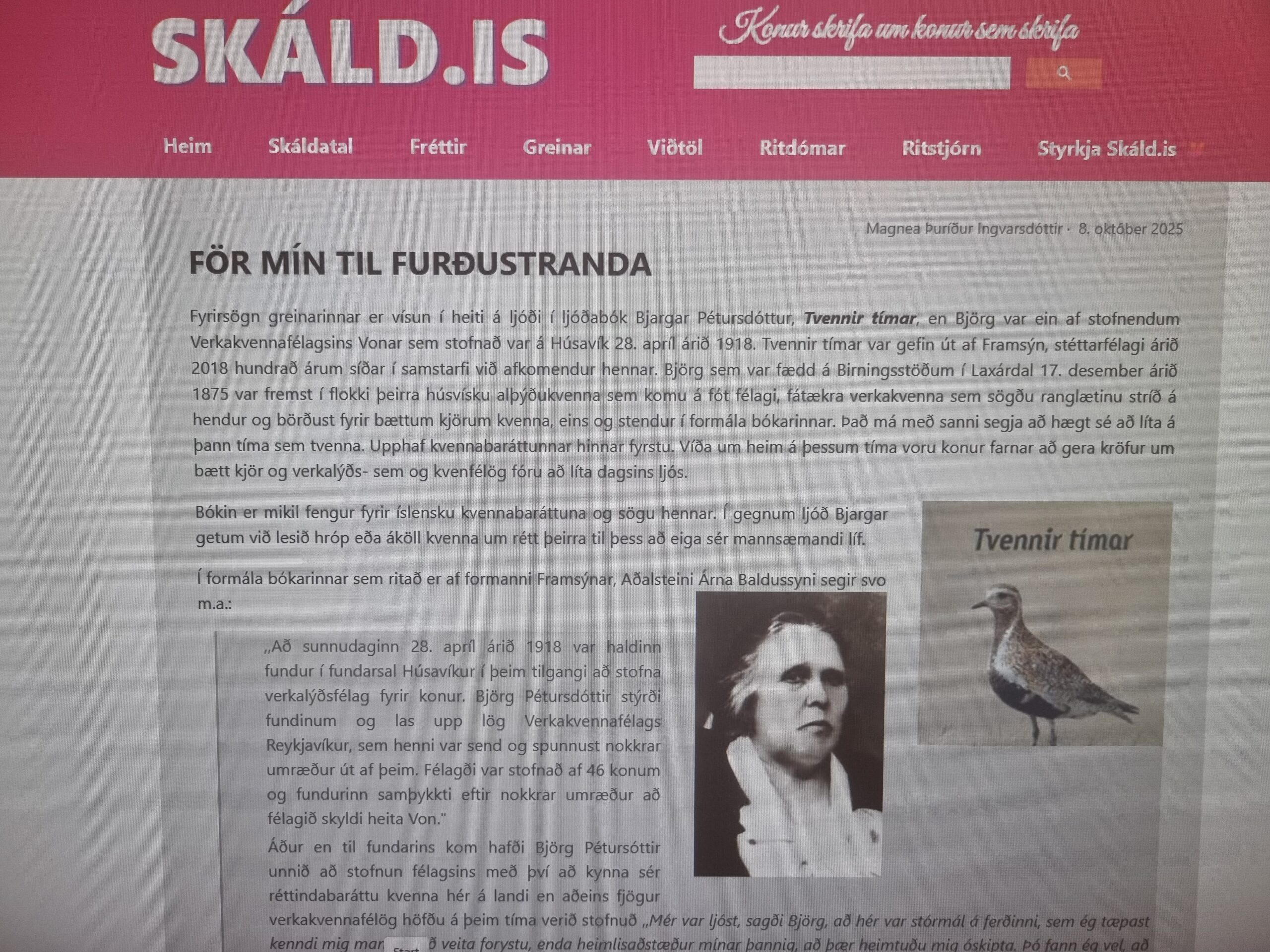 Bókin er mikil fengur fyrir íslensku kvennabaráttuna og sögu hennar. Í gegnum ljóð Bjargar getum við lesið hróp eða áköll kvenna um rétt þeirra til þess að eiga sér mannsæmandi líf. Sjá nánar inn á skald.is: https://skald.is/greinar/475-for-min-til-furdustranda