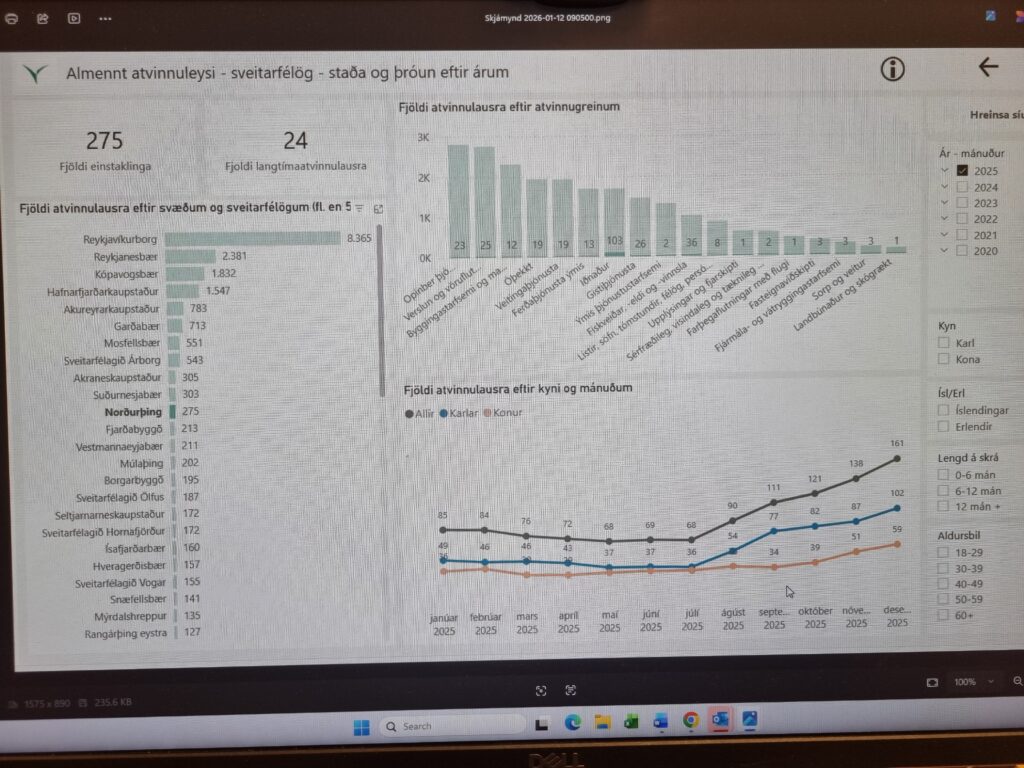 Hvað atvinnuleysið varðar í Þingeyjarsýslum þá hefur það stóraukist milli ára. Á meðfylgjandi myndum má sjá að í ársbyrjun 2025 voru 65 einstaklingar á atvinnuleysisskrá í sveitarfélaginu Norðurþingi en voru 161 um síðustu áramót. Hvað Þingeyjarsveit varðar, þá voru 47 einstaklingar án atvinnu í ársbyrjun 2025 en voru 68 í árslok. Hér að neðan má sjá frekari upplýsingar um þróunina hvað atvinnuleysið varðar milli sveitarfélaga og landshluta, sem er því miður, ekki gæfuleg.