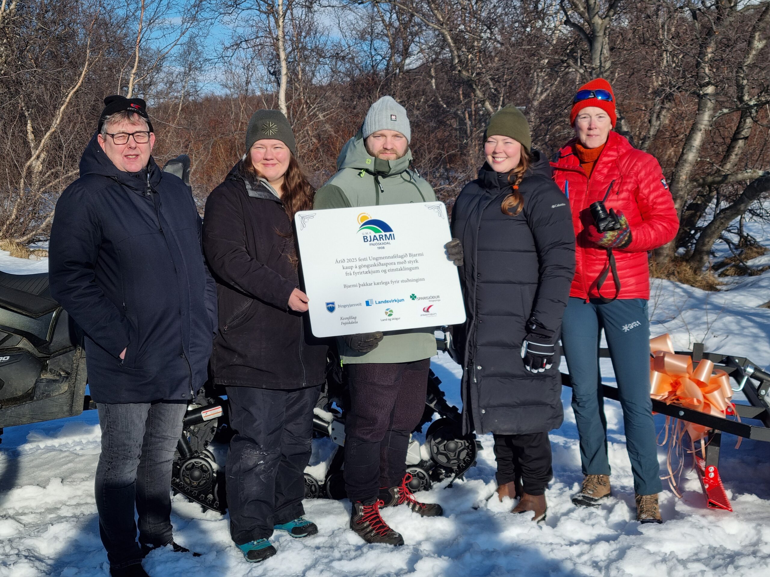 Nýr skíðagönguspori var vígður í Vaglaskógi í gær á árlegum fjölskyldudegi UMF Bjarma. Félagið fjárfesti nýverið í sporanum ásamt beltabúnaði og tönn, sem verður sett undir nýtt sexhjól Lands og Skóga. Búnaður af þessu tagi kostar nokkrar milljónir, sem er ansi stór biti fyrir lítið ungmennafélag. Réðst Bjarmi því í fjársöfnun á nýliðnu ári, og lögðu fjölmargir einstaklingar, fyrirtæki og félagasamtök söfnuninni lið. Land og Skógur, sem hefur yfirumsjón með Vaglaskógi kemur til með að sjá um sporann, troða brautir, grisja og huga að öðru því sem tryggir að allar aðstæður verði til fyrirmyndar. Nýi búnaðurinn er afar kærkominn og mun gjörbreyta aðstöðu fyrir skíðagöngufólk og annað útivistarfólk  sem sækir skóginn heim yfir vetrartímann. Framsýn var meðal þeirra sem lögðu söfnuninni lið og vill félagið með því móti efla starfsemi Ungmennafélagsins Bjarma, sem gegnir líkt og önnur ungmennafélög mikilvægu hlutverki í sínu byggðarlagi. Meðfylgjandi myndir voru teknir í veðurblíðunni í Fnjóskadal í gær þar sem fjölmörg mættu í skóginn til að fagna nýja skíðagöngusporanum og gæða sér á gómsætum veitingum í boði Bjarma. Þar  á meðal fulltrúar frá Framsýn var var sérstaklega boðið að vera við vígsluna. Hægt er að nálgast fréttir af sporunum með því að fylgja Skíðagöngubrautir í Vaglaskógi á facebook. Á meðfylgjandi forsíðumynd eru Aðalsteinn Árni Baldursson og Ósk Helgadóttir frá Framsýn og Úla Áradal, Sigríður Árdal og Karl Magnússon frá Umf. Bjarma.
