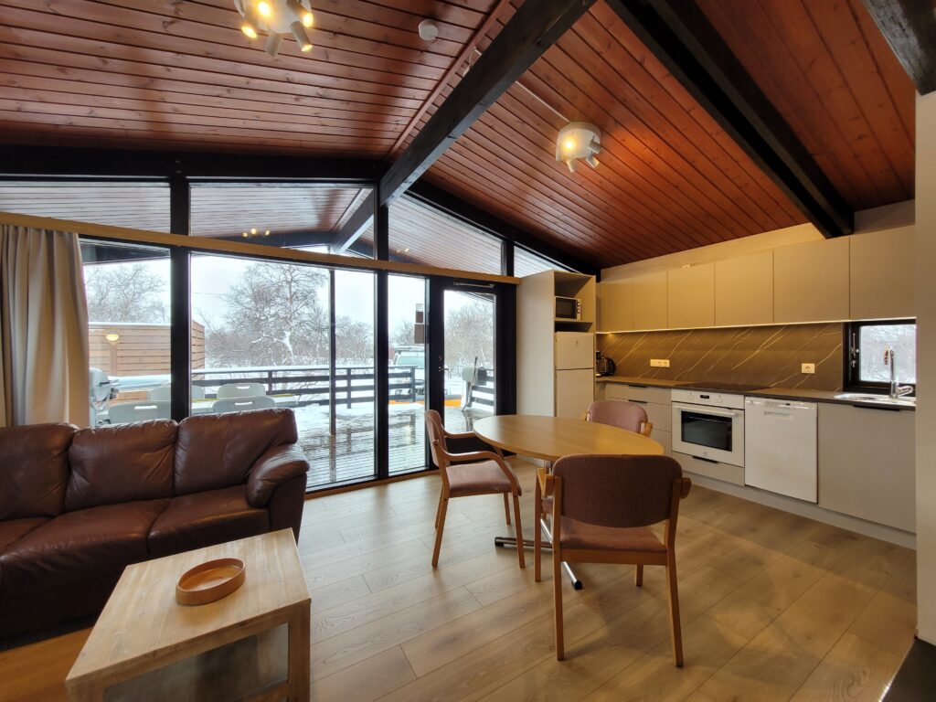 Húsið er 45 m2. Í því eru 2 svefnherbergi, setu- og borðstofa með eldhúskrók og baðherbergi með sturtu.